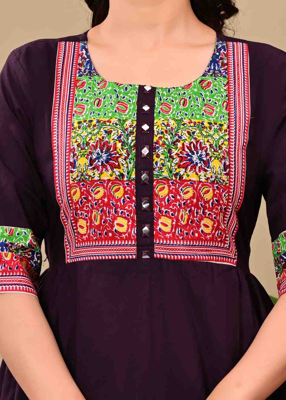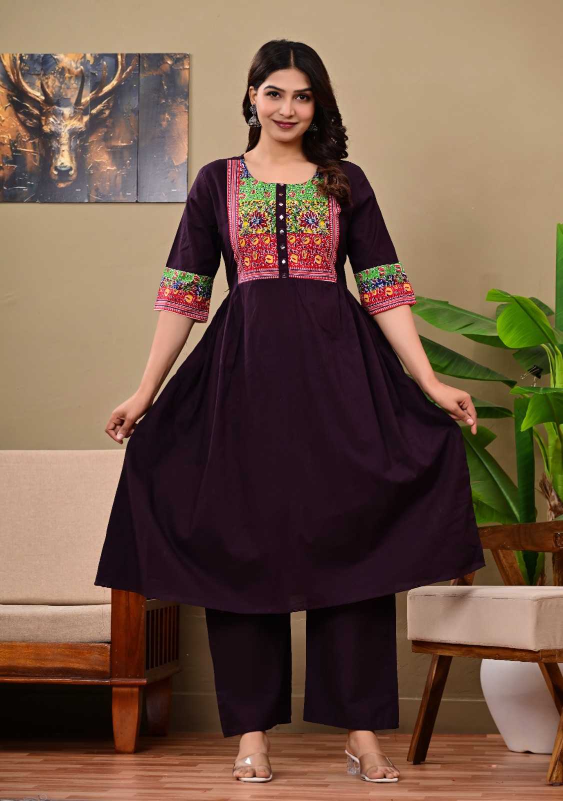 Bring refined elegance to your ethnic collection with this Women Cotton Kurta Pant Set from Bunai India, designed in a rich deep purple shade that exudes grace and sophistication. Crafted using premium quality cotton fabric, this kurta set offers a soft, breathable and skin-friendly feel, making it comfortable for long hours of wear. The vibrant multicolour ethnic embroidery on the yoke creates a striking contrast against the deep purple base, giving the outfit a distinctive handcrafted appeal.