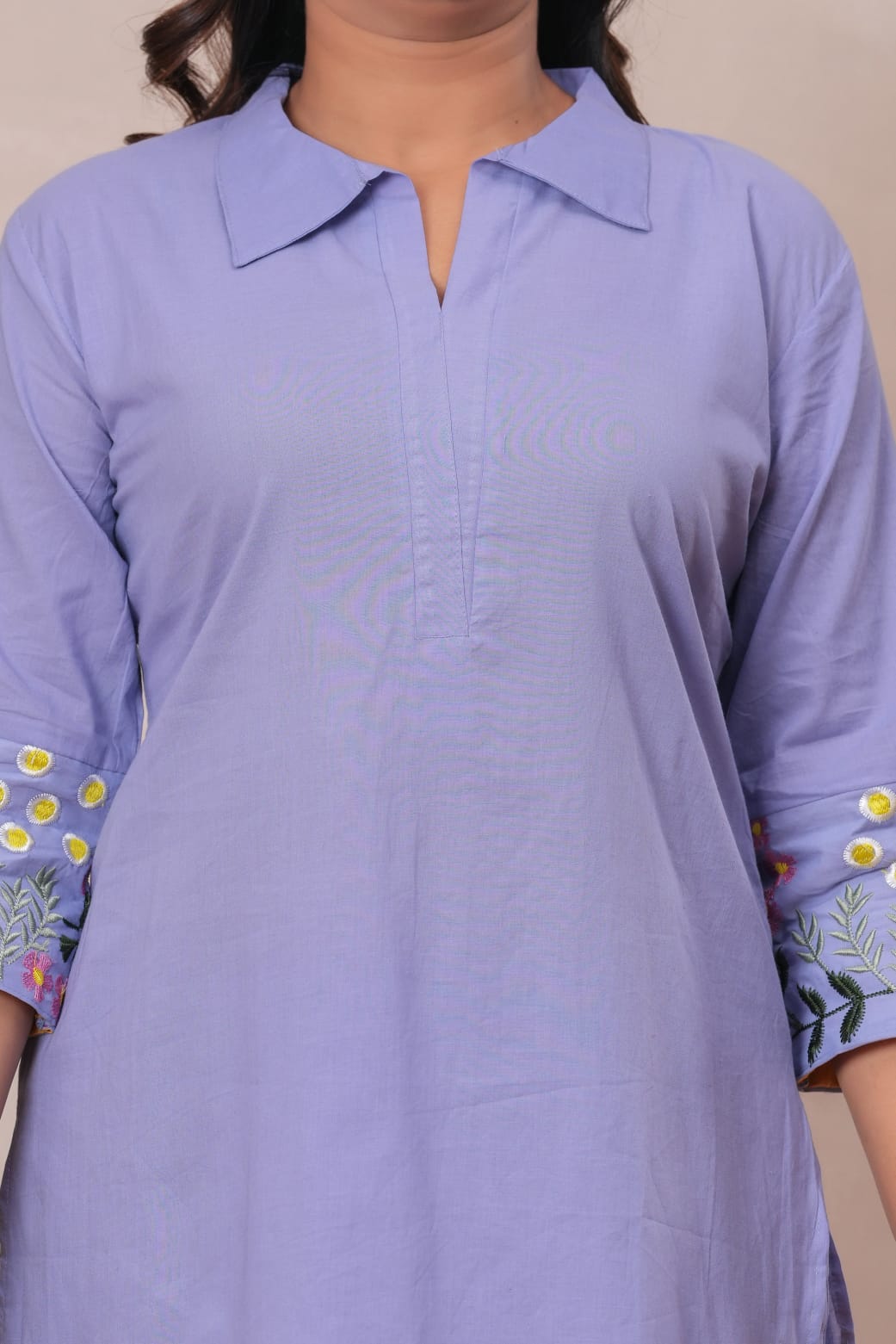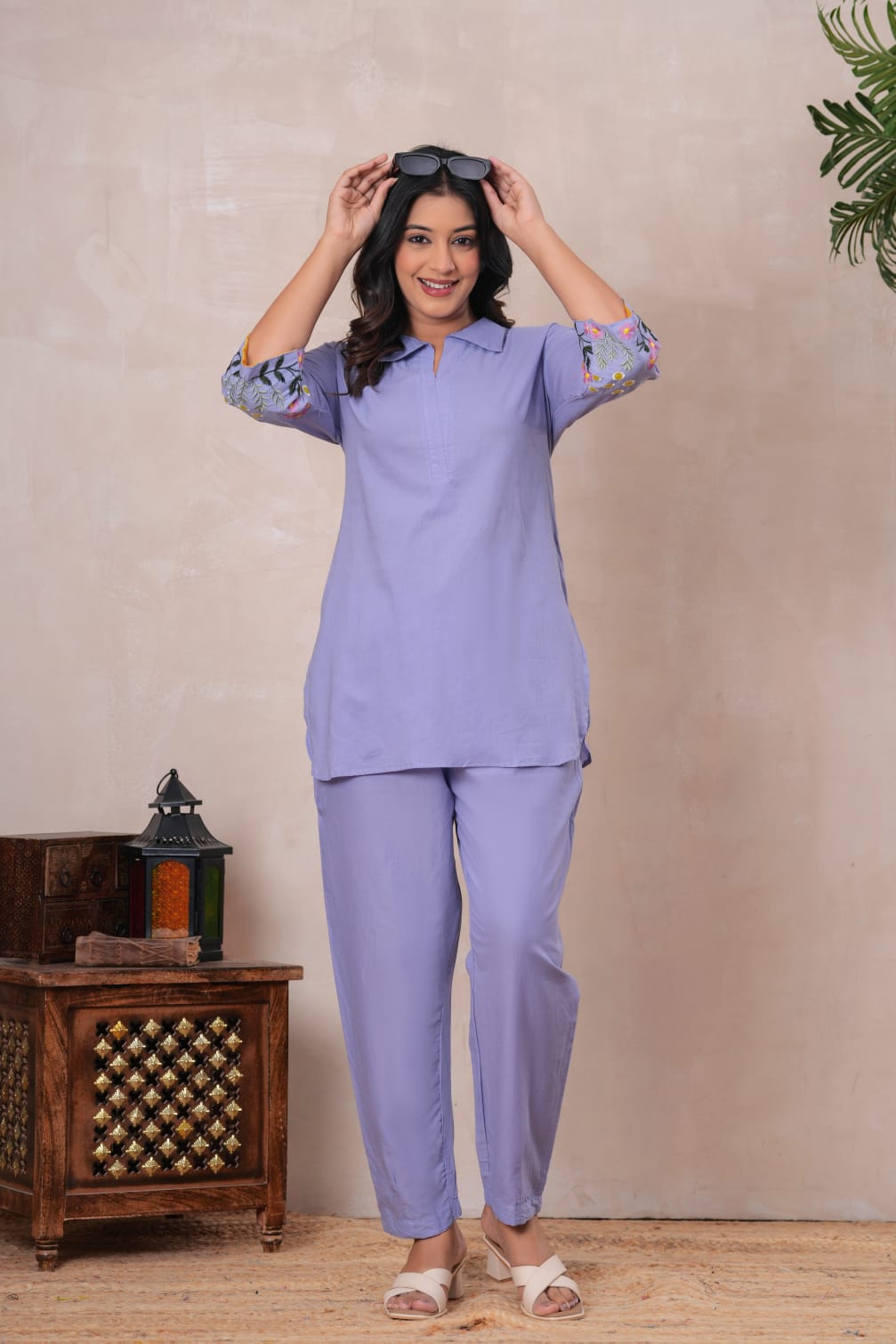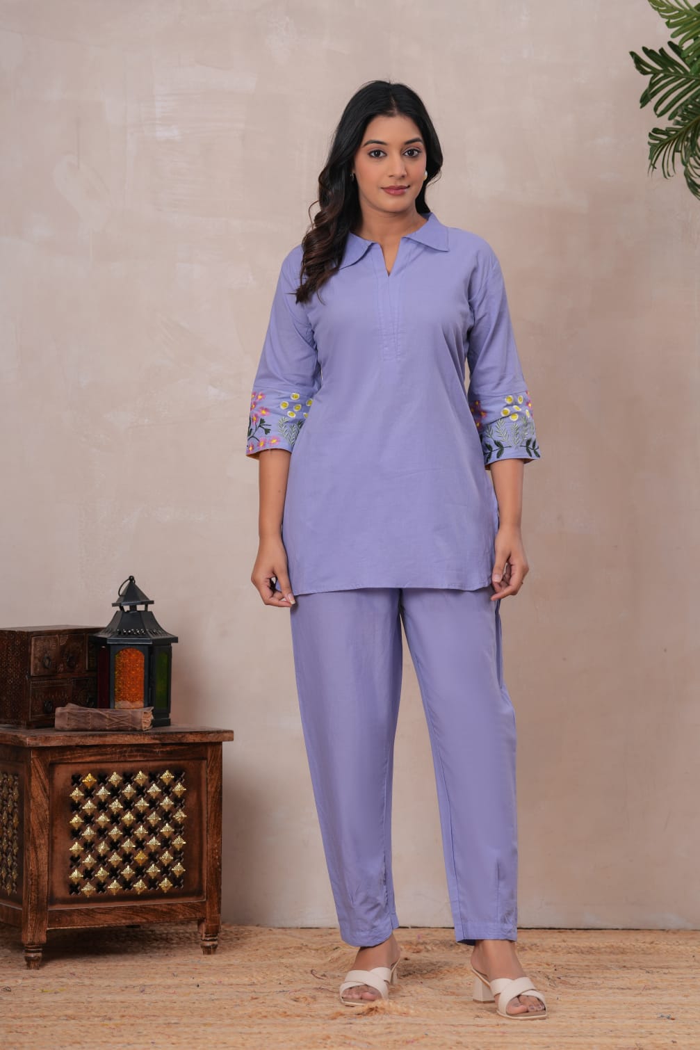Refresh your wardrobe with this stylish women cotton co-ord set in a soothing lavender shade. Crafted from soft and breathable cotton fabric, this co-ord set ensures all-day comfort while maintaining a graceful look. The top features subtle embroidery on the sleeves that adds a touch of elegance, paired with a perfectly matching bottom for a coordinated outfit.