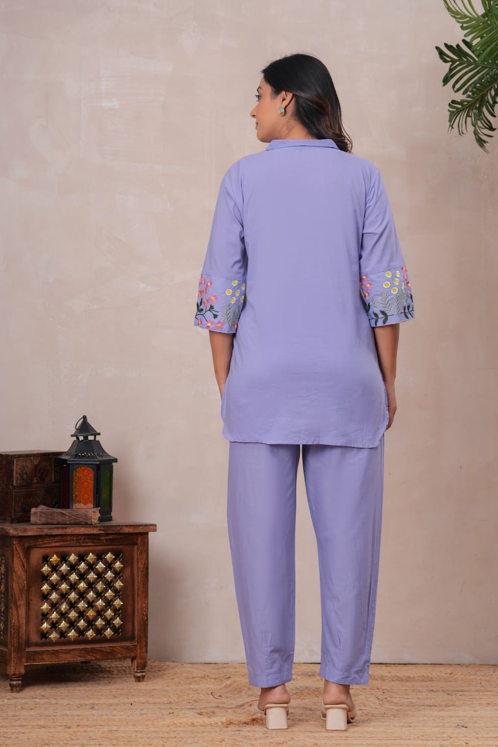 Be the first to review “Women Cotton Co-Ord Set – Lavender Embroidered Top & Bottom | Bunai India”